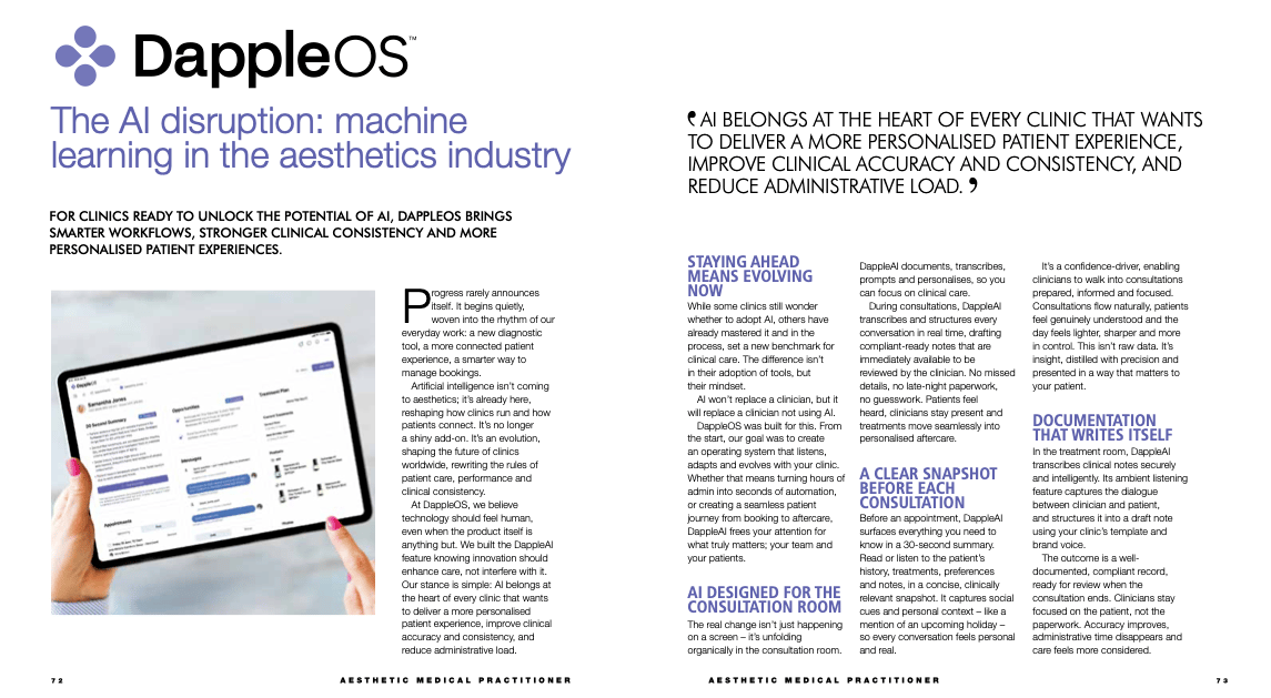 Artificial intelligence isn’t coming to aesthetics, it’s already here, reshaping how clinics run and how patients connect. It’s no longer a shiny add-on, it’s an evolution shaping the future of clinics worldwide, rewriting the rules of patient care, performance and clinical consistency.